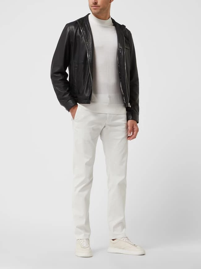 Die Lederjacke von Baldessarini ist aus echtem Leder gefertigt und gerade geschnitten. Sie kommt mit Stehkragen, Brustleistentasche und Eingrifftaschen.
