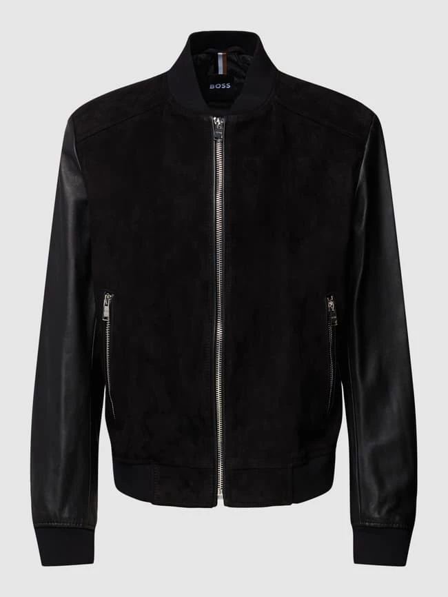 Die Lederjacke von BOSS ist aus reinem Leder gefertigt und gerade geschnitten. Sie zeigt sich mit geripptem Rundhalsausschnitt sowie Reißverschlusstaschen.