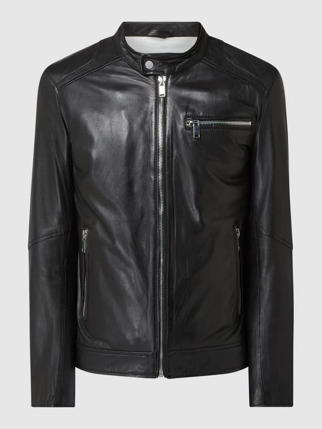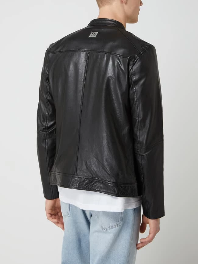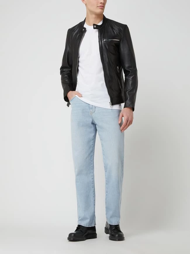Die Lederjacke von Freaky Nation ist aus Leder gefertigt und gerade geschnitten. Sie kommt mit Stehkragen und Reißverschlusstaschen.