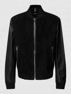Aktion ? BOSS Lederjacke Mit Geripptem Rundhalsausschnitt Modell ‘Malbano’ – Schwarz ?